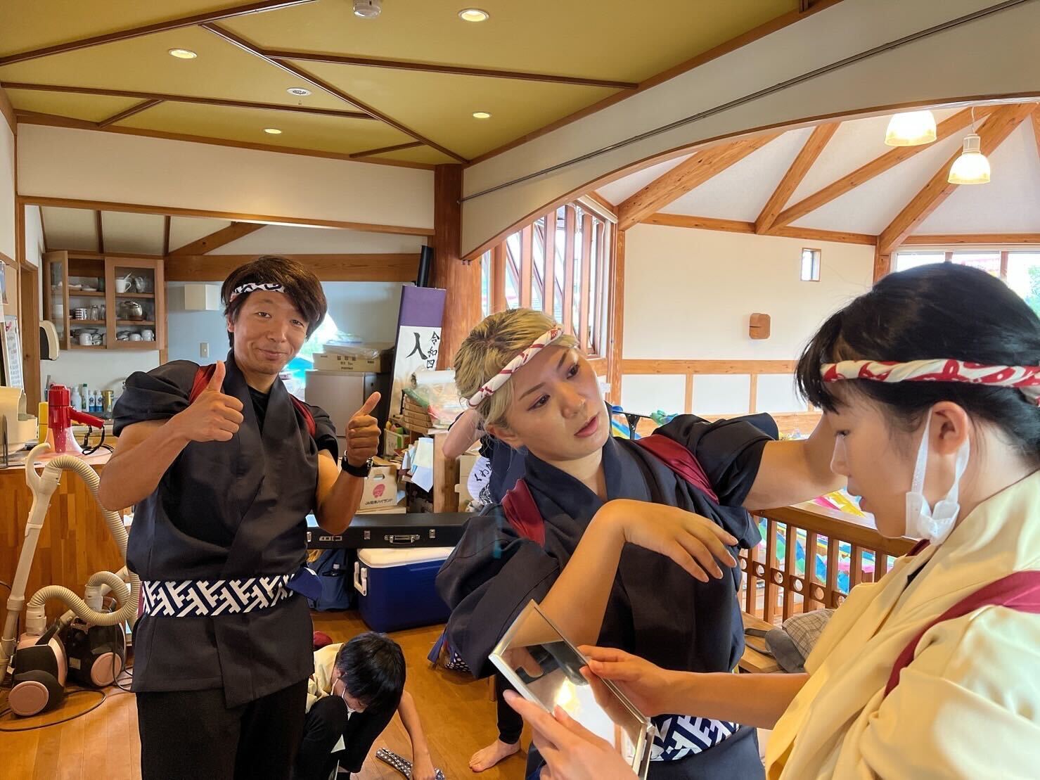 公演用の法被を着て帯を締め、たすきを掛けて、手拭いをねじりハチマキにして準備完了。