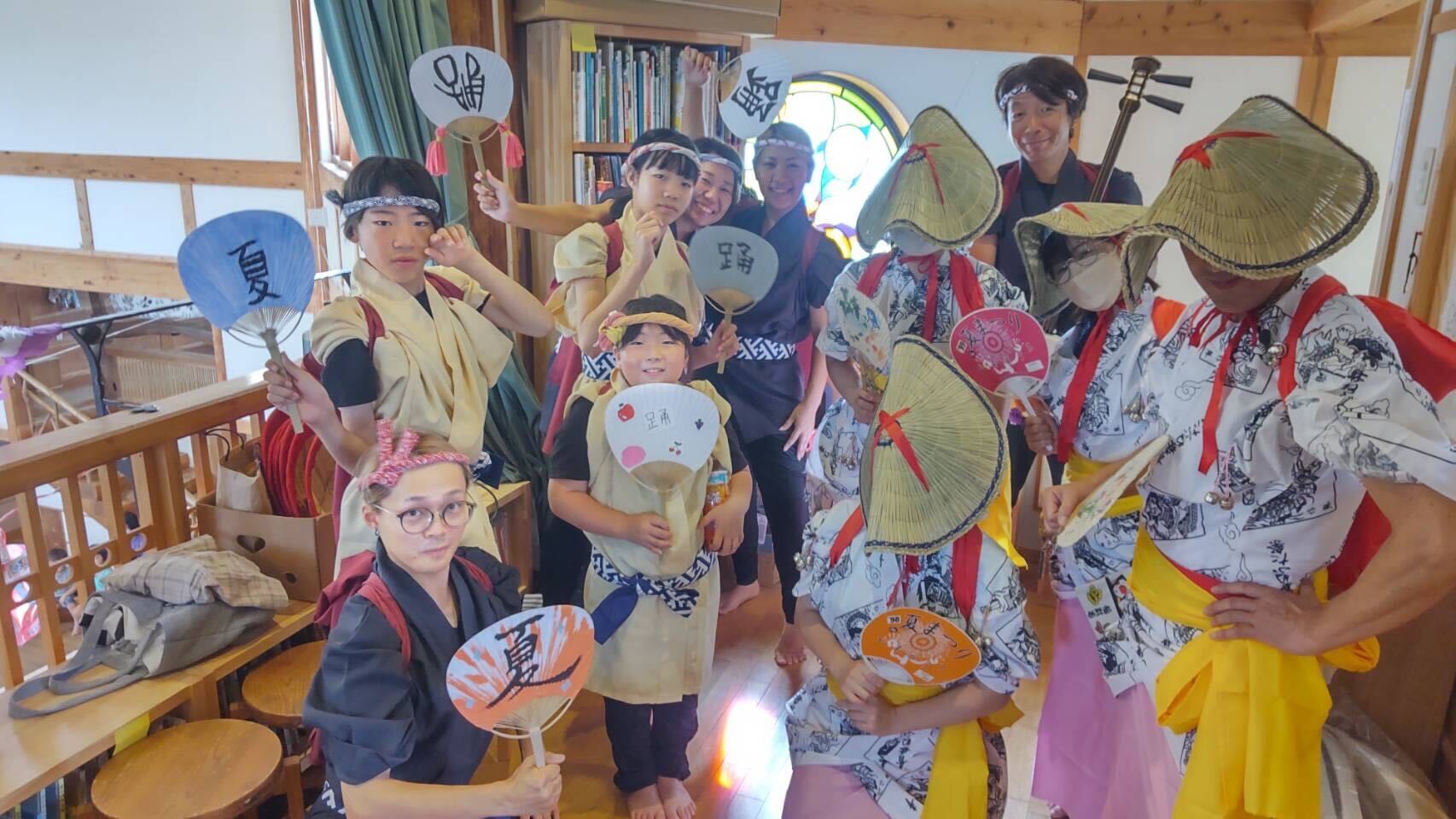 今回、うちわの柄を自分たちで描いていて、「夏」または「踊」の漢字を入れて、それ以外は自由に描き込んでもらっています。