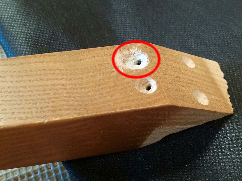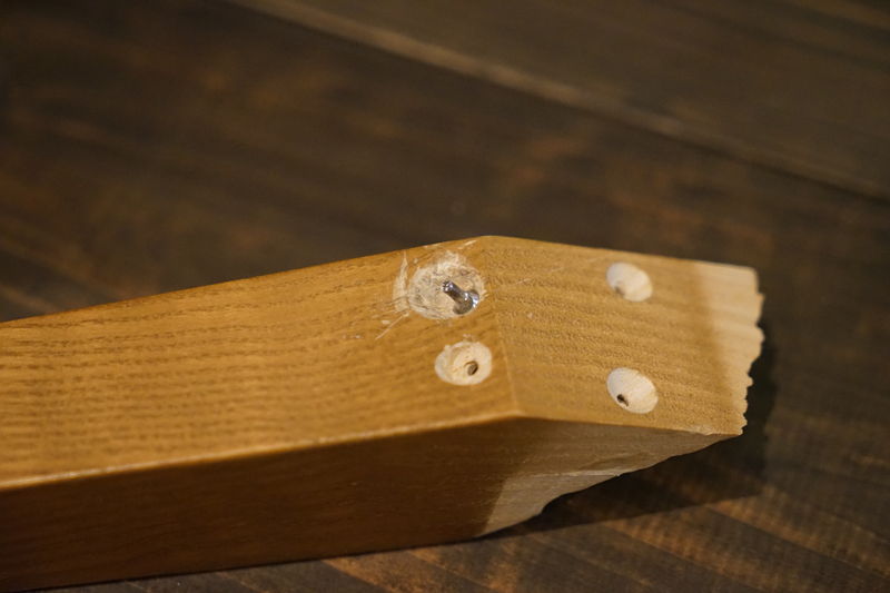 何故か削られた部分があって、さらに両側に木ダボの穴が空いていて、今回の椅子の脚はそれらを全て通るように割れていました。