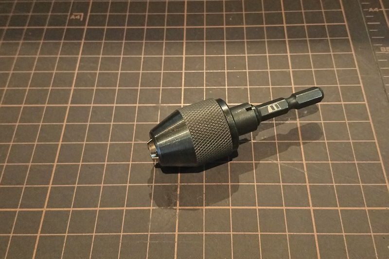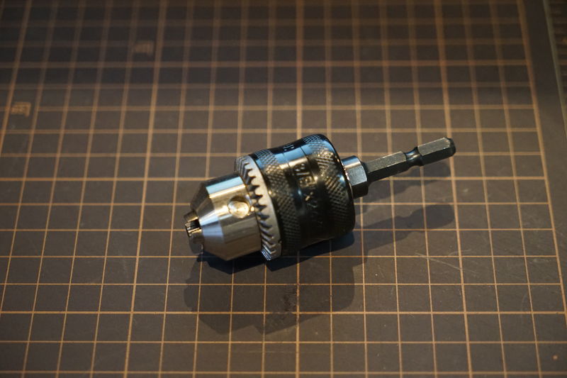 ドリル用チャックはドリルで穴を開ける方向に回すと締まりますが、今回のようにネジを外す方向に回す(逆回転させる)と緩んでしまいます。(左下の写真)