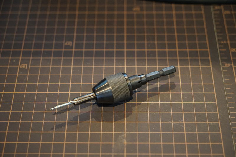 しかし、出ているネジの軸部分が短くネジを斜めに通すようにしたこともあって、逆回転チャックの胴部分が当たってしまってネジの軸部分をしっかり掴むことができず、何度か試行錯誤してみたものの、そのままだとネジは外せませんでした。