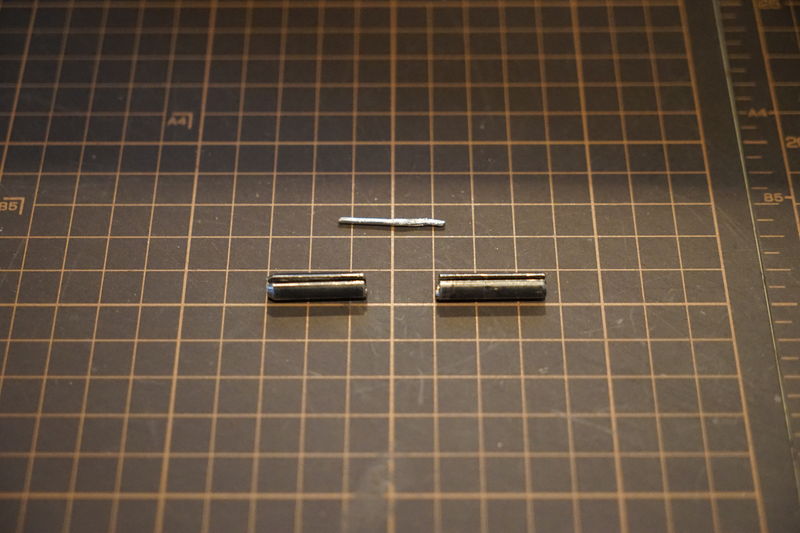 購入してもらったセットには専用ピンの小と大(それぞれ、ビスの直径が3.2~3.8mm用の物と、4.0~4.8mm用の物)が2本ずつ入っているので、大の方の1本を半分に切ってネジのすぐ近くを逆回転チャックで掴めるようにしました。