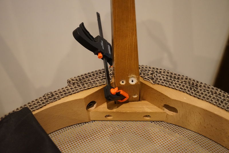 とりあえずネジを一旦すべて外してから、クランプで折れた脚を椅子に仮止めし、折れた脚の方に空けたネジ穴を使って椅子側に下穴を開けました。