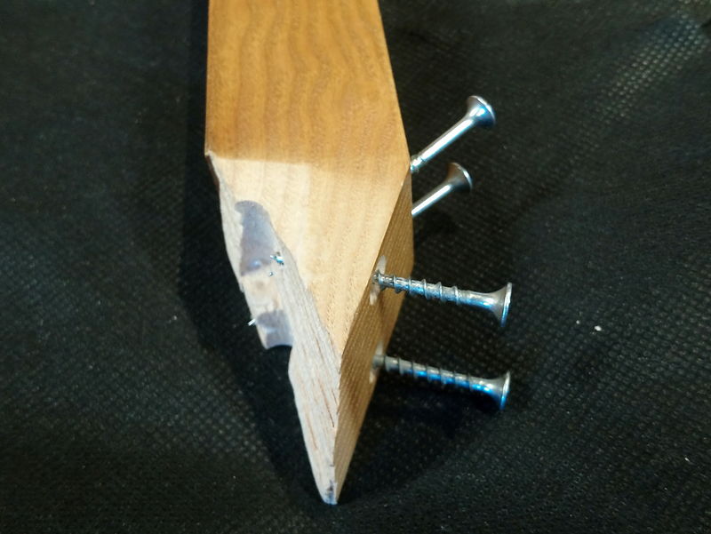 長いネジの片方は問題なさそうでしたが、もう片方は年輪の影響か下穴の方向が曲がって少しずれてしまいました。これは直しようがなさそうなのでこのまま進めます。