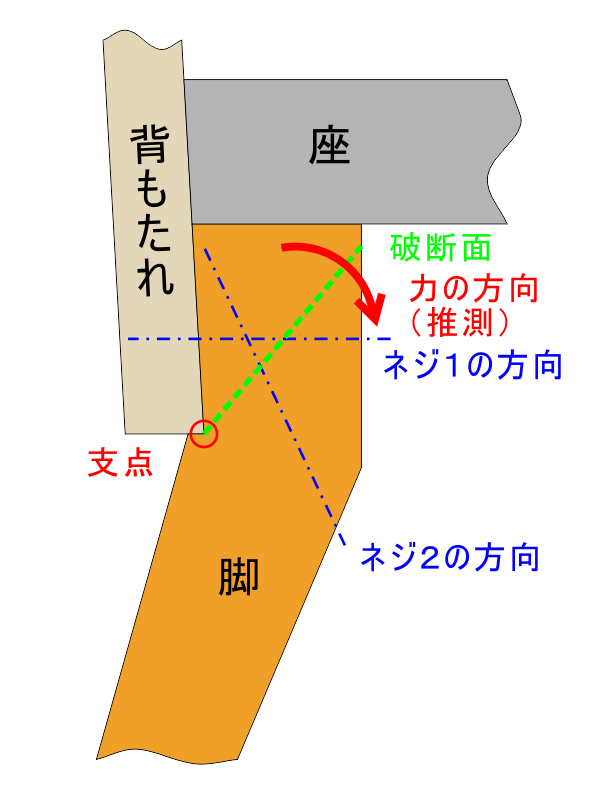 力の集中する部分が削られたりその近くに穴が開けられたりしているため強度が下がっており、この椅子の脚は折れるべくして折れた、というような印象でした。