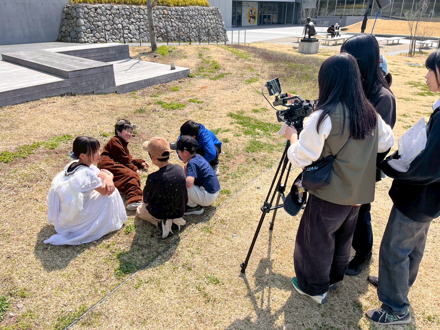 近隣の建物や近くの神社など、班ごとにさまざまなロケ地へ出発!