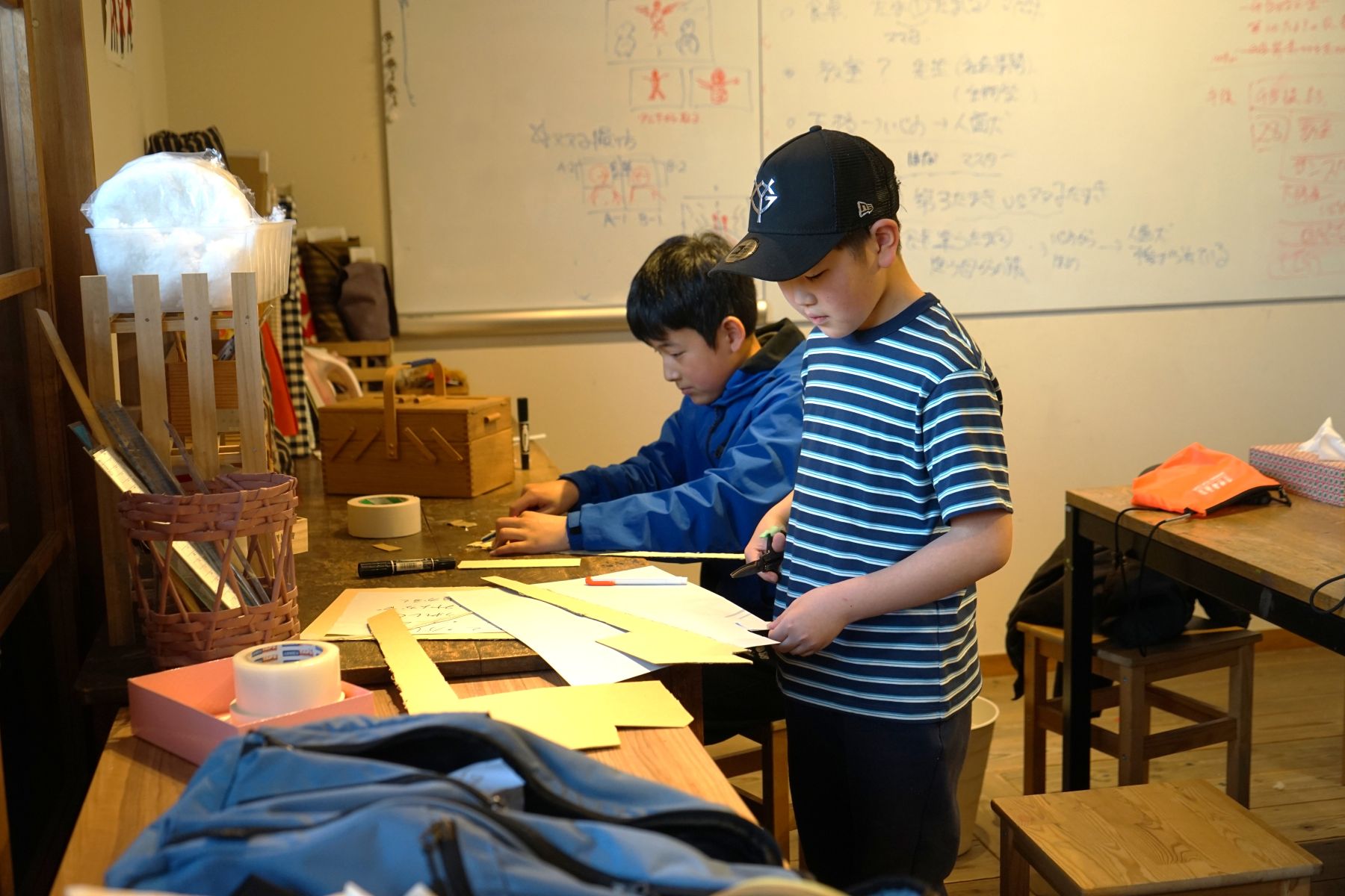 横町ラボは、絵の具やダンボール、布などがそろう、ものづくりの宝庫です。