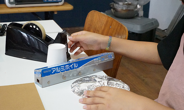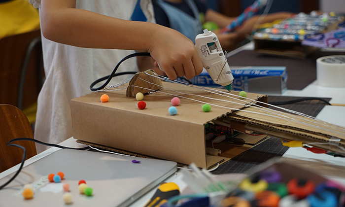 ワークショップでは、ダンボールやアルミホイル、針金を使って、電子楽器を作りました。